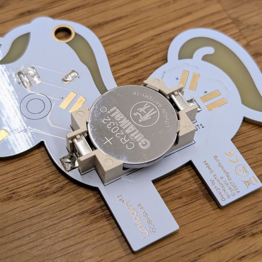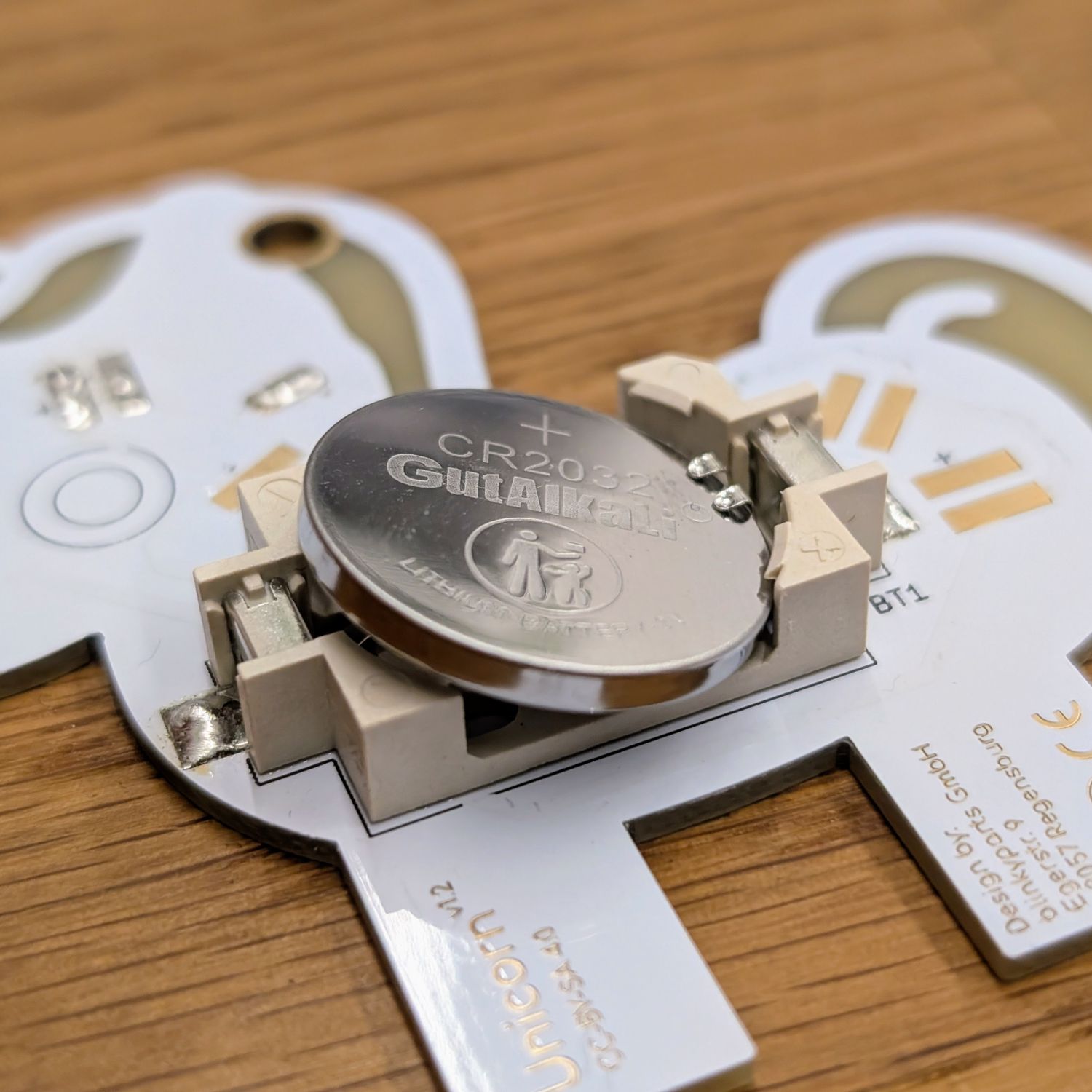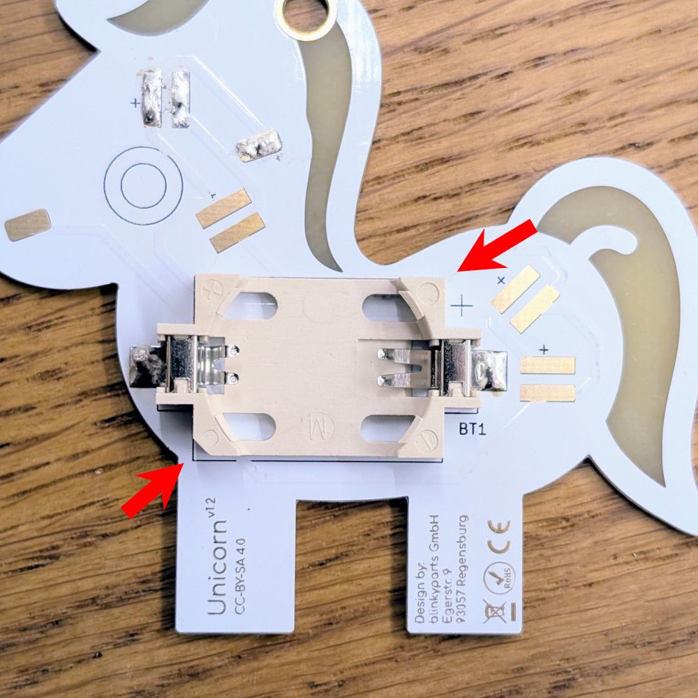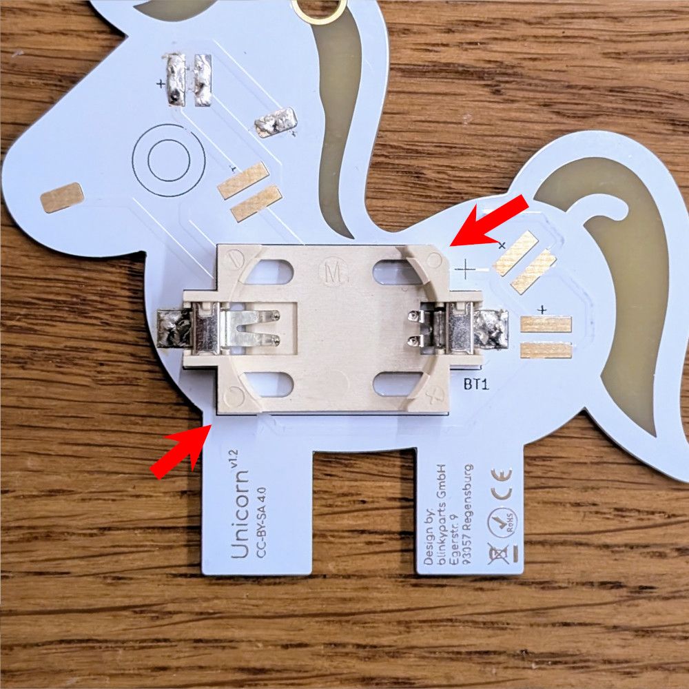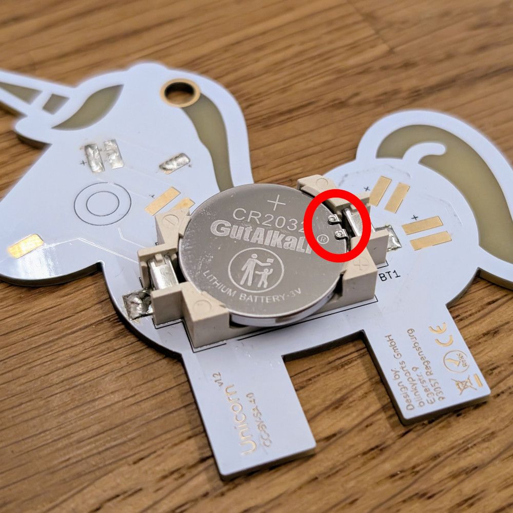 Einer der häufigsten Fehler, aber auch der der am leichtesten zu fixen ist: Die Batterie ist falsch eingesetzt! Die positive Seite der Batterie muss nach oben (von der Platine weg) zeigen. Der Greifer auf der positiven Seite des Batteriehalters muss auf die Oberfläche greifen! Dieser wird gerne einfach mit nach unten weg gedrückt.