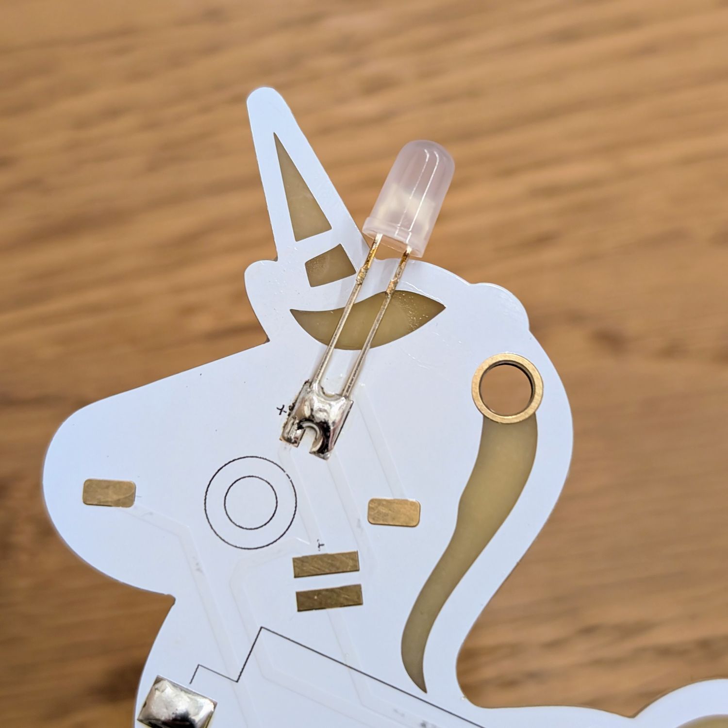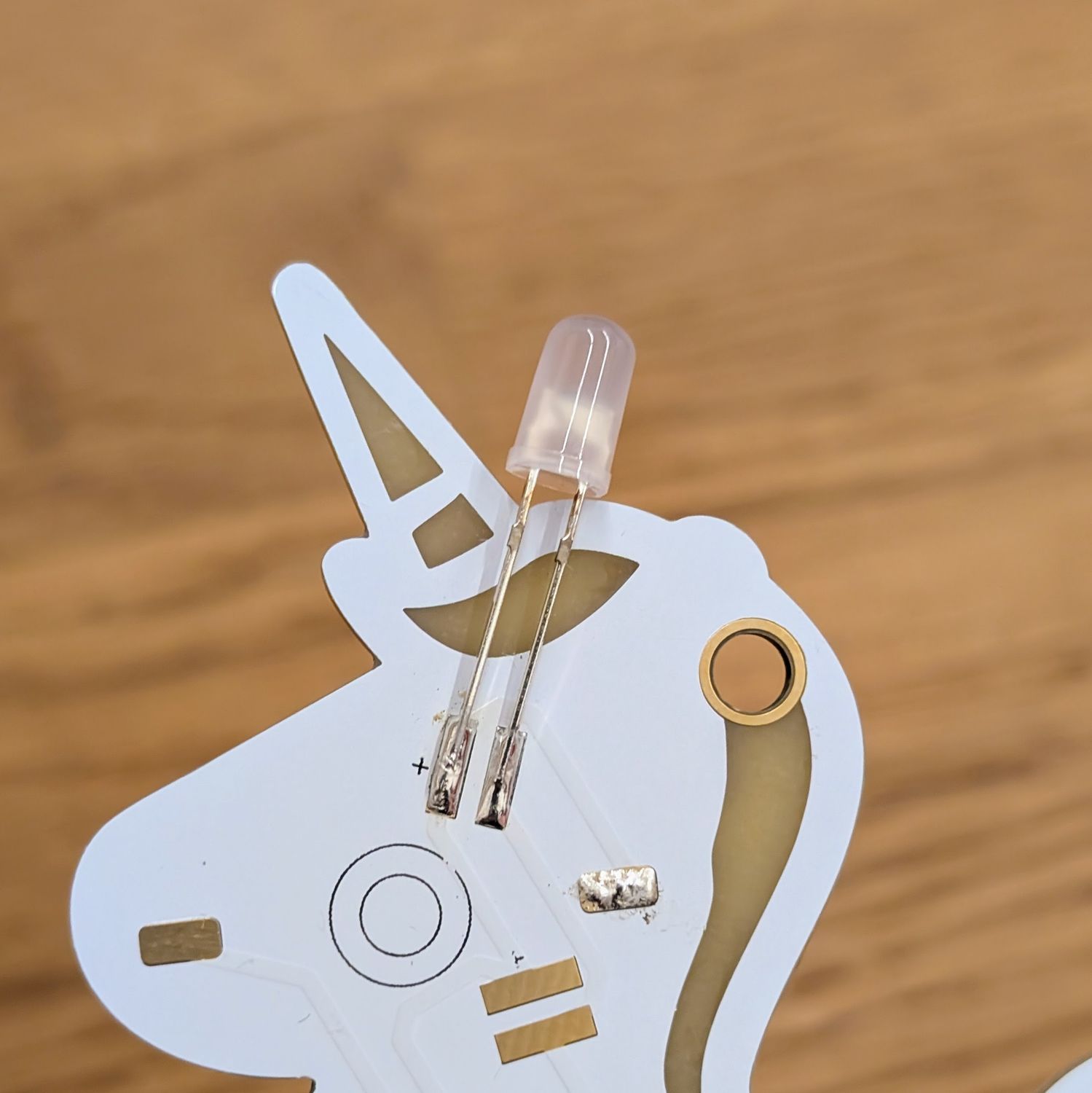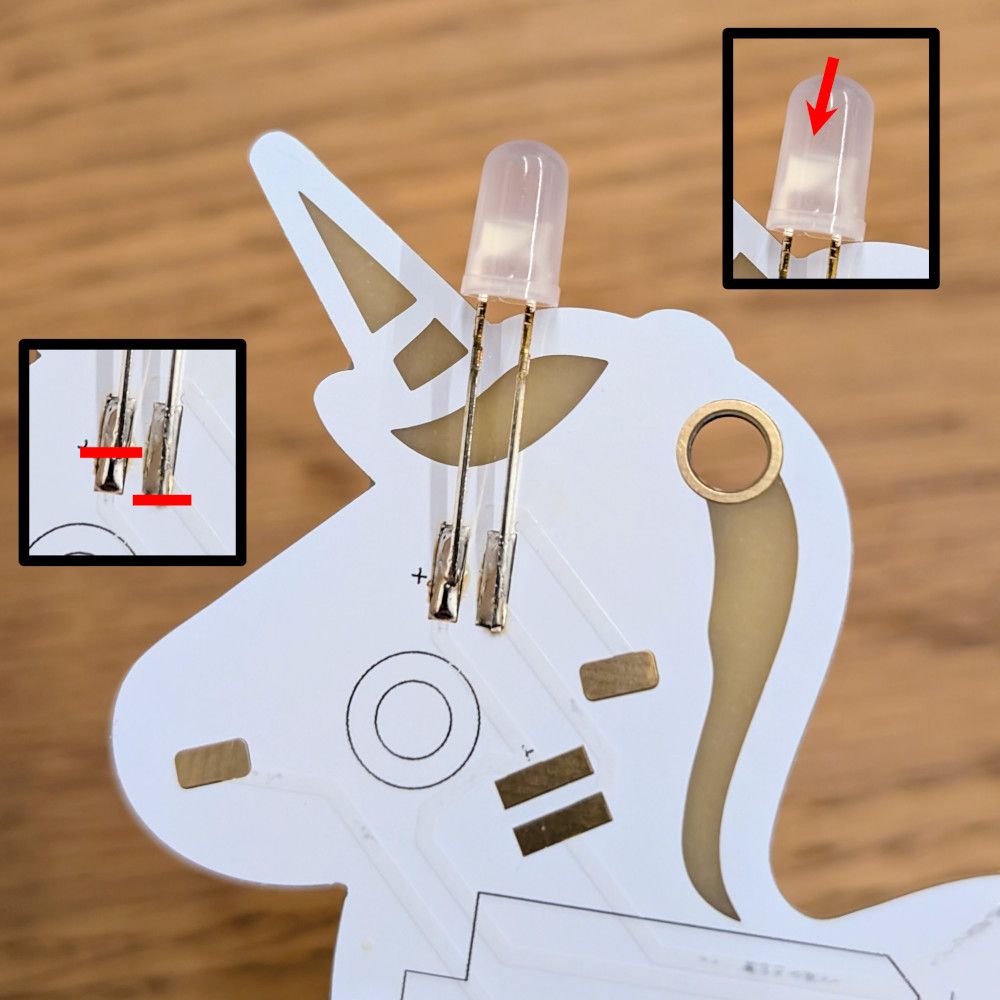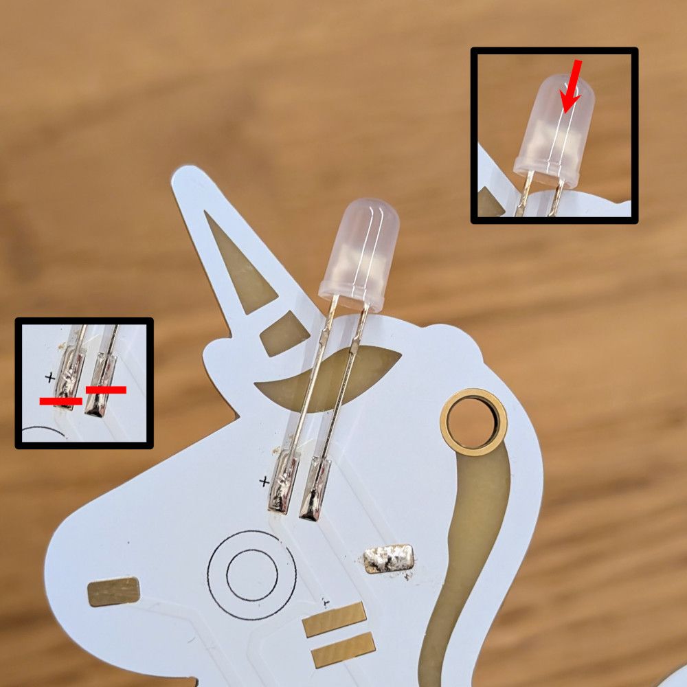 Wird nur eine LED in einem Bausatz falsch herum eingelötet, kann es sein, dass gar keine LED leuchtet. Entferne dann sofort die Batterie. Zur Identifikation des Fehlers musst du in den milchigen Kopf der LED schauen. Dort ist eine Pfanne und ein Stab zu erkennen. Die Pfanne ist auf der negativen Seite, der Stab auf der positiven Seite.