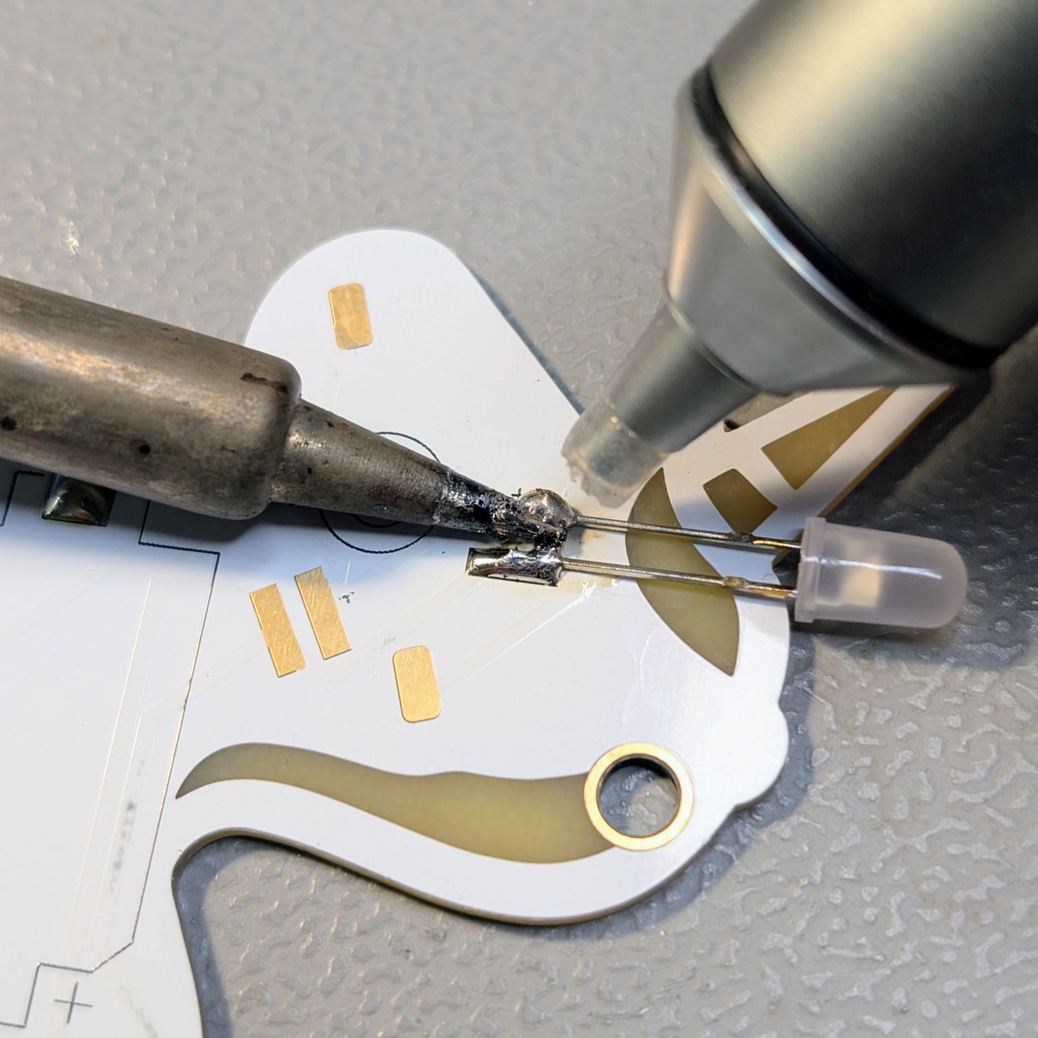 Halte die LED am Kunststoffkopf fest und erwärme mit dem Lötkolben beide seiten (positiv und negativ) der Lötstellen. Ziehe die LED dann vorsichtig ab. Drehe die LED richtig herum und löte diese wieder fest. Verwende frisches Lötzinn und achte darauf, keine Lötbrücke zu verursachen.