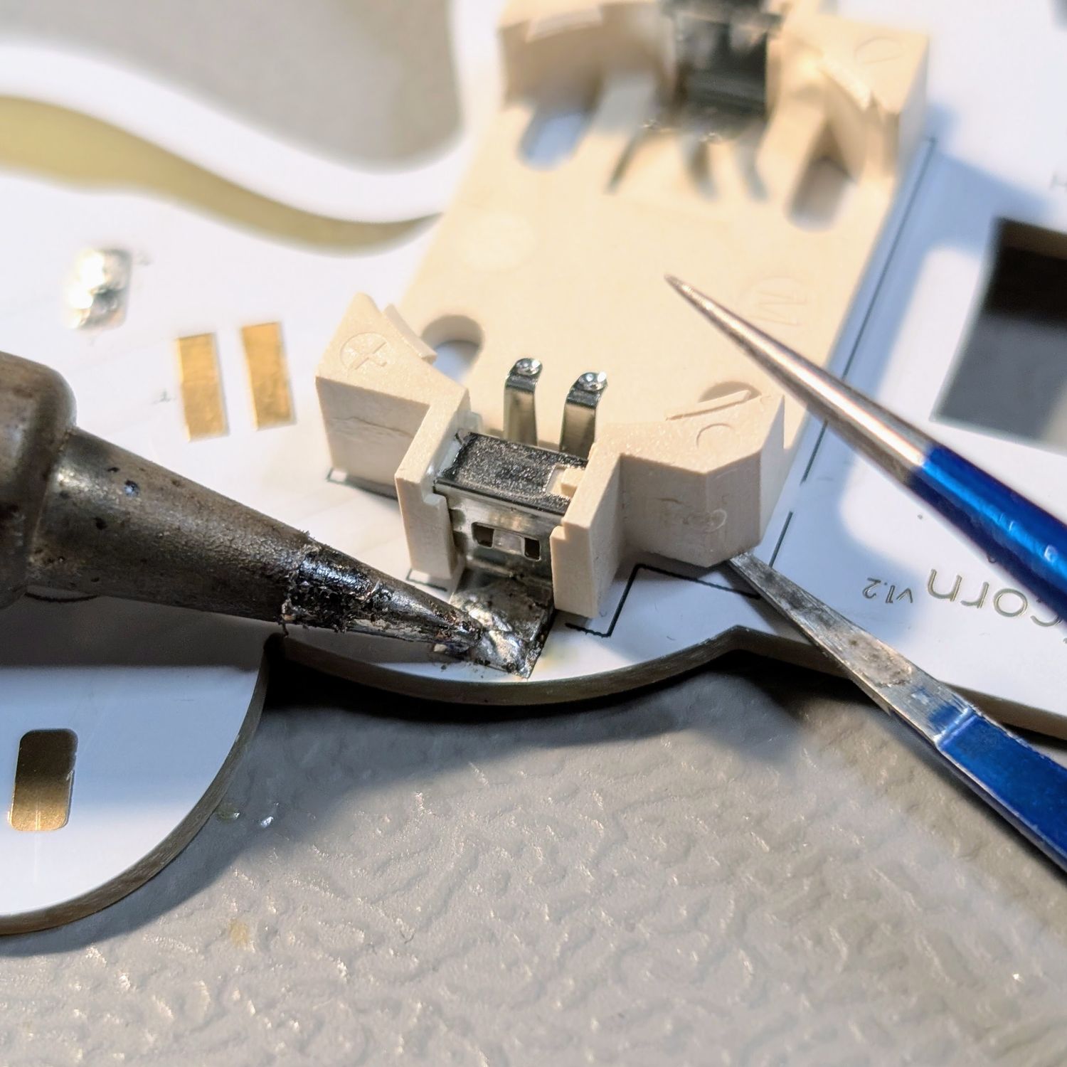 Tipp: Löse die Lötverbindungen in dem du eine Löstelle nach der anderen wieder heiß machst und mit einer Pinzette leichten druck gibst, sodass sich der Batteriehalter wieder ablöst. Widerhole das auf der anderen Seite und drehe den Batteriehalter dann auf die richtige Seite. Verwende frisches Lötzinn beim neu verlöten.
