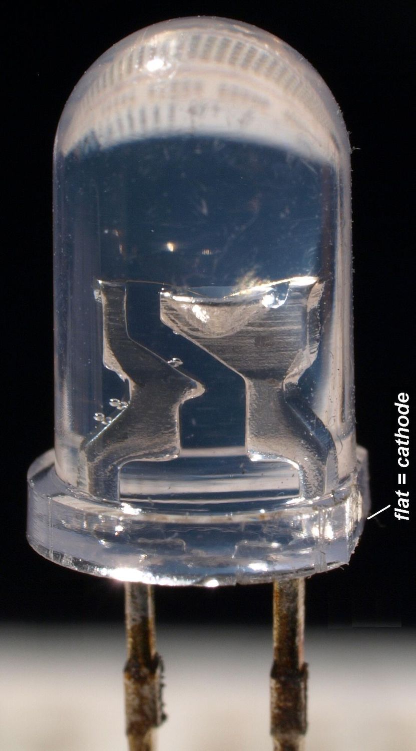 ACHTUNG: Normalerweise kann man die Kathode auch an einer abgeflachten Seite der LED erkennen, das ist leider nicht immer der Fall und keine zuverlässige Identifikations-Methode.